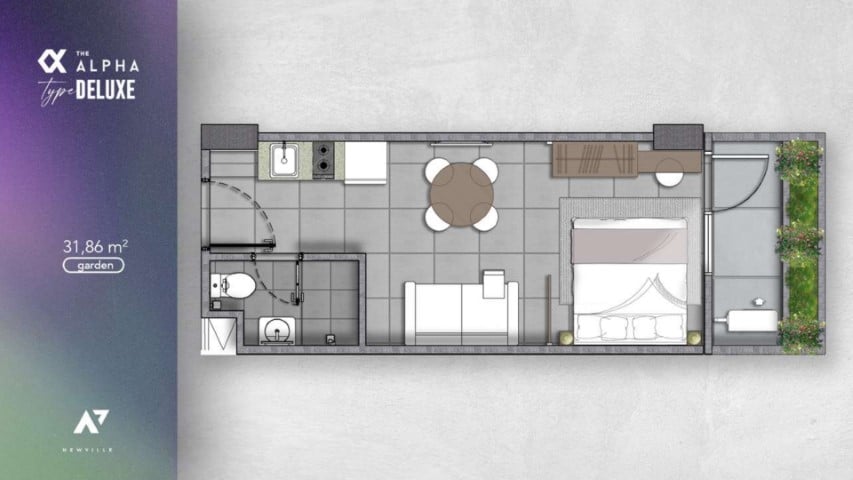 Tipe apartemen Newville selanjutnya adalah tipe Deluxe yang berada di Tower The Alpha yang lokasinya ada di District Florence. Anda bisa memilih salah satu dari 3 pilihan unit tipe Deluxe yaitu unit standard,unit corner, dan Garden (private enclosed space).